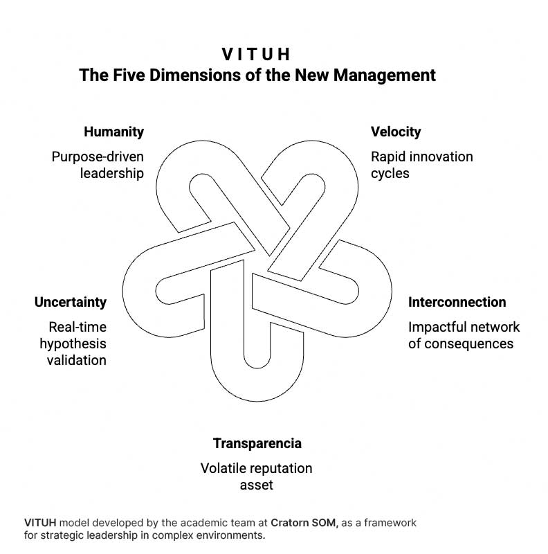 Las cinco dimensiones definen esta nueva realidad: velocidad, porque los ciclos de innovación se reducen de décadas a meses; interconexión, porque cada decisión impacta en una red de consecuencias que trasciende industrias y geografías; transparencia, porque la reputación es el activo más volátil del ecosistema; incertidumbre, porque las decisiones son hipótesis que se validan en tiempo real; humanidad, porque las personas buscan propósito, no solo estabilidad, liderazgo consciente antes que control jerárquico.